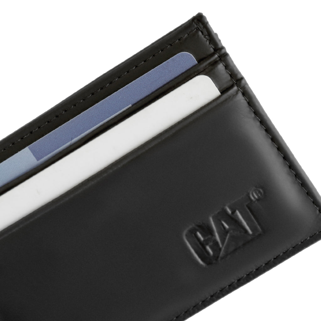 Billetera de cuero premium con sistema de extracción de tarjetas, capacidad para 6 tarjetas y protección RFID. Sus medidas son 11 x 7.5 x 0.1 cm, con volumen 0 L y peso de 0.038 kg, elaborada en cuero de primera calidad (top grain leather).